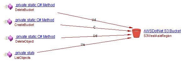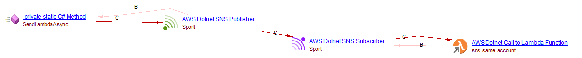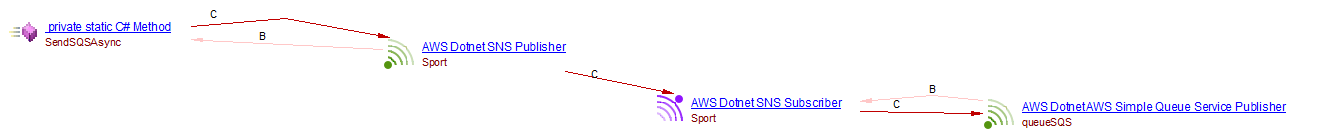 For the Publish method, a AWS Dotnet SNS Publisher object is created. Its name is that of the topic. For the Subscribe methods, a AWS Dotnet SNS Subscriber object is created. Its name is that of the topic. Then for each supported protocol, an object is created with a callLink from the subscriber to that object. The supported protocols are the following:
