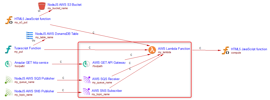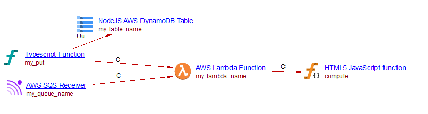 Some links will be created only when some objects created by other extensions are created with a minimal version for these other extensions as described below. Also if old versions of these other extensions are used, the AWS API Gateway, the AWS SQS Receiver, and AWS SNS Subscriber object may not be linked to the AWS Lambda Function object but to its handler (i.e. the HTML5 JavaScript function in the previous example)