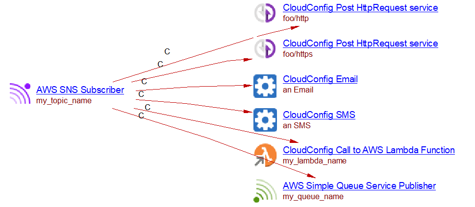 A Nodejs SNS Subscriber object named my_topic_name is created. Then for each supported protocol, an object is created with a callLink from the subscriber to that object. The supported protocols are the following: