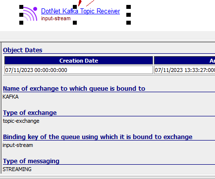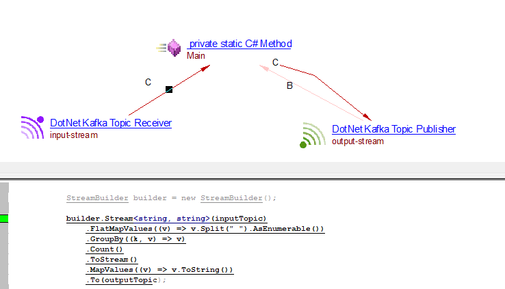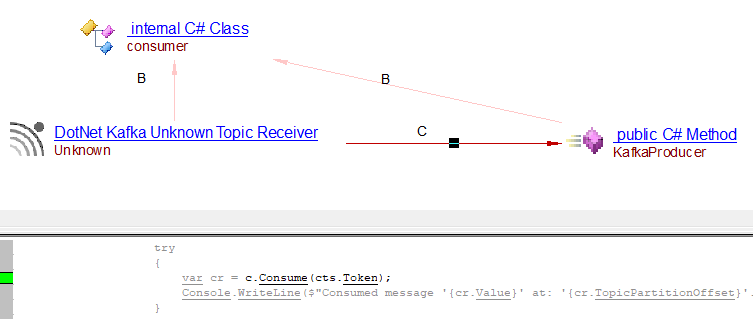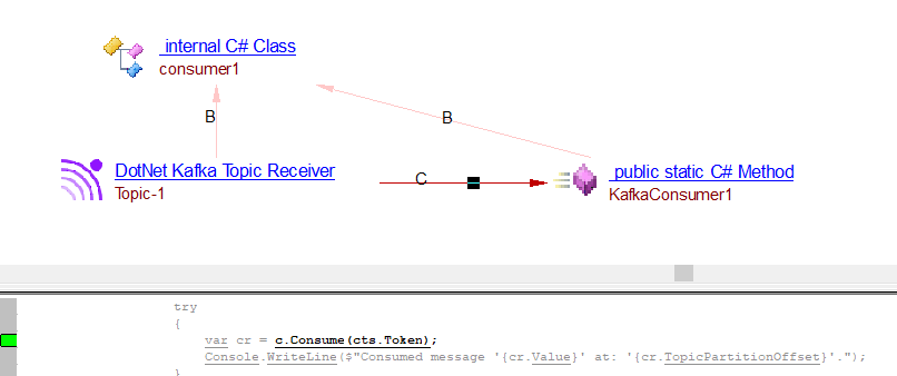 | callLink | callLink between the DotNet Kafka Topic Receiver object and the caller C# method | Consumer API’s support by .Net Kafka: Confluent.Kafka.IConsumer.Consume MassTransit.KafkaConfiguratorExtensions.TopicEndpoint |