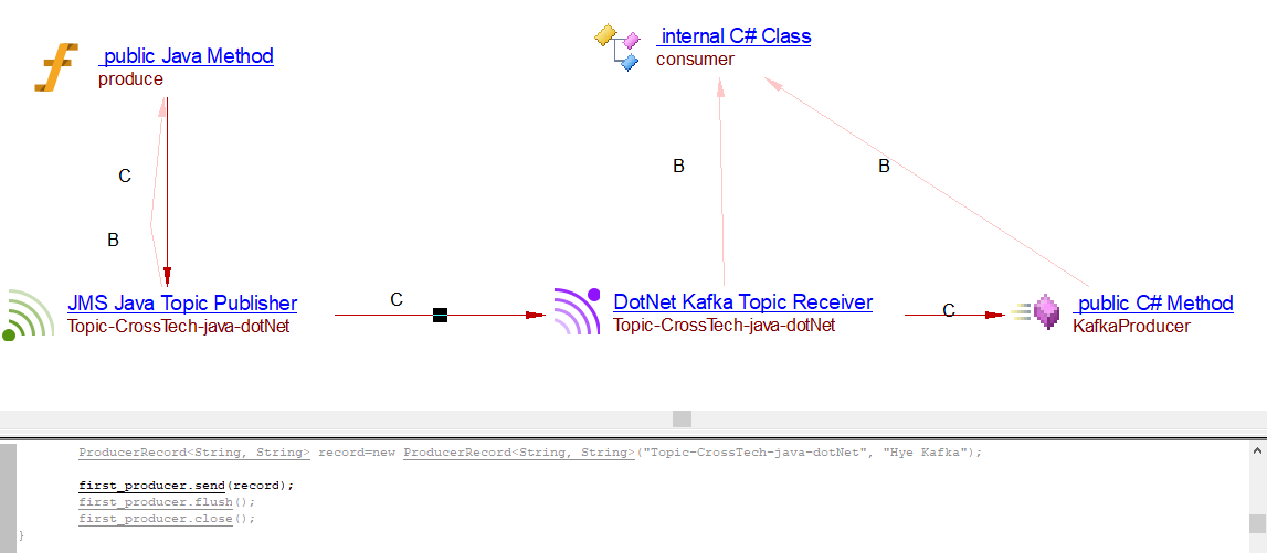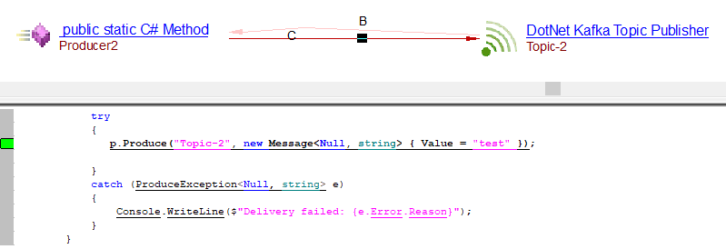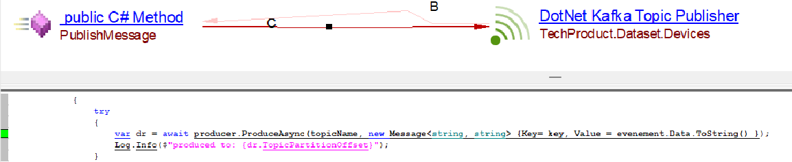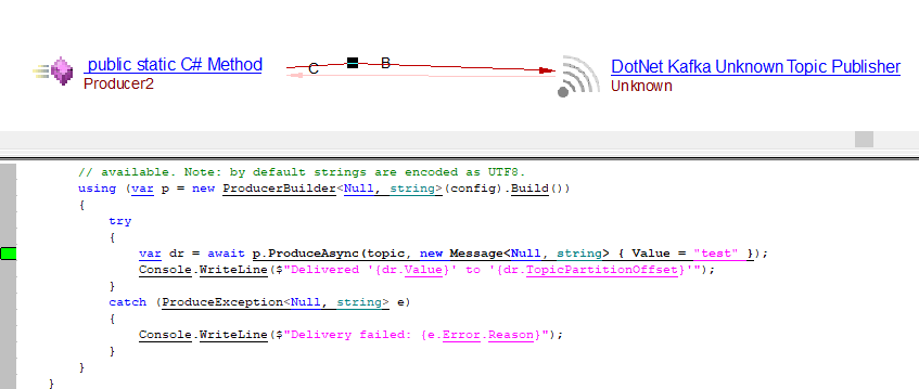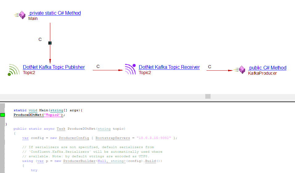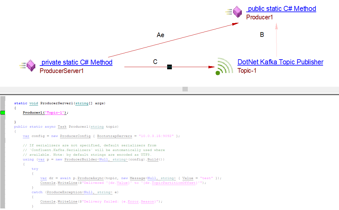 | callLink | callLink between the caller C# method and the DotNet Kafka Topic Publisher object | Producer API’s support by .Net Kafka: Confluent.Kafka.IProducer.Produce Confluent.Kafka.IProducer.ProduceAsync DotNetCore.CAP.ICapPublisher.Publish DotNetCore.CAP.ICapPublisher.PublishAsync DotNetCore.CAP.ICapPublisher.PublishDelay DotNetCore.CAP.ICapPublisher.PublishDelayAsync MassTransit.KafkaProducerRegistrationExtensions.AddProducer MassTransit.KafkaConfiguratorExtensions.TopicProducer Streamiz.Kafka.Net.Stream.IKStream.To |