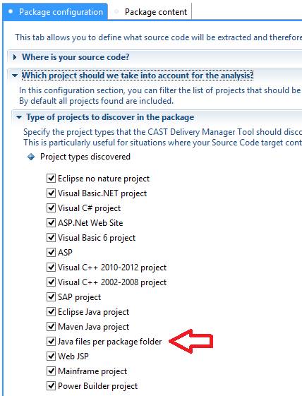 In the CAST Delivery Manager Tool, in the Package configuration tab, the interface will contain a new item in the list of Project types discovered called Java files per package folder:
