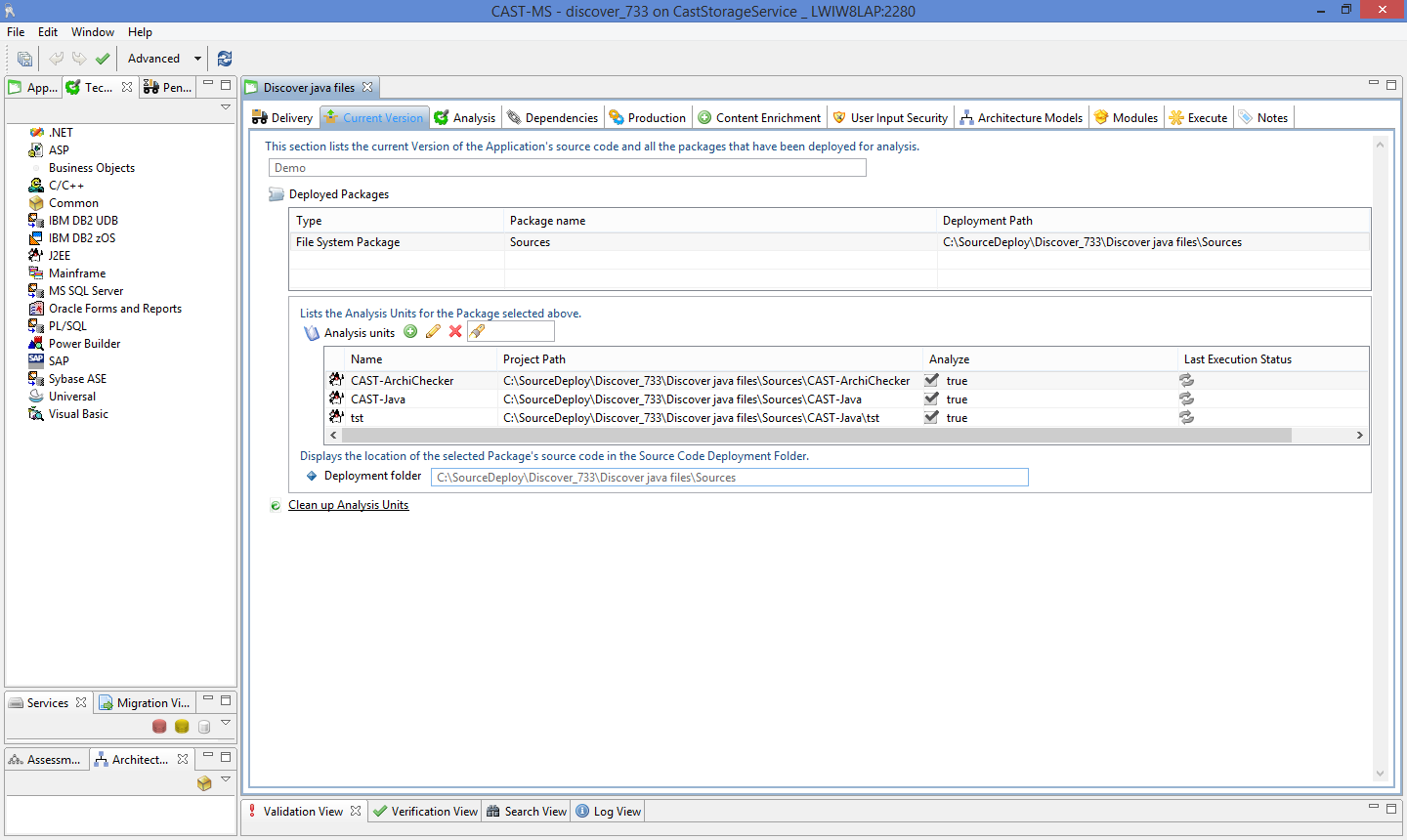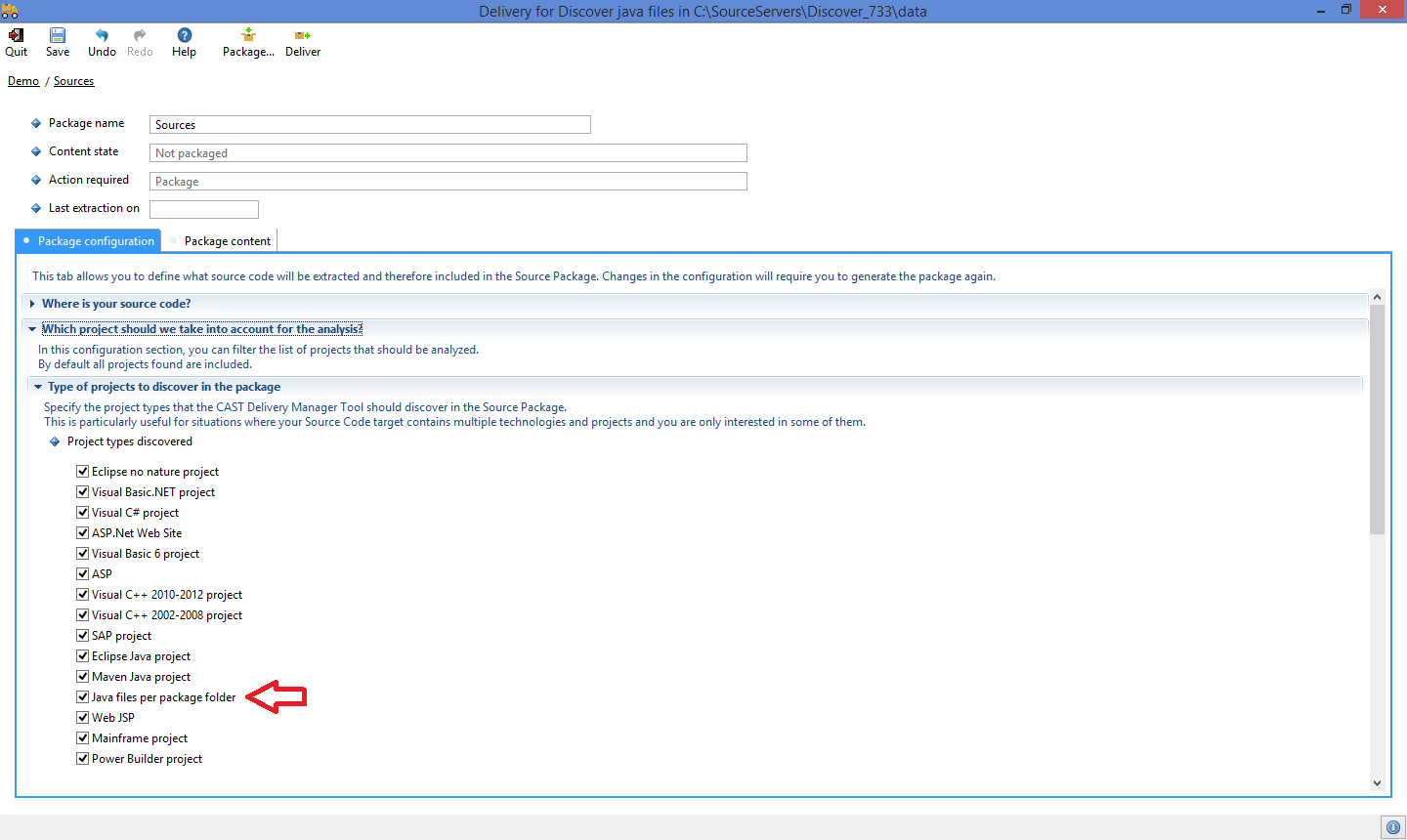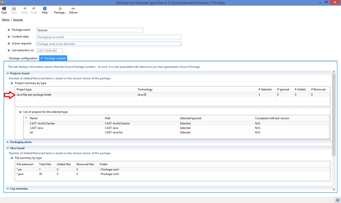 In the CAST Delivery Manager Tool, in the Package content tab, when the package contains some .java files, the interface will display a new item in the list of “Project types discovered”: