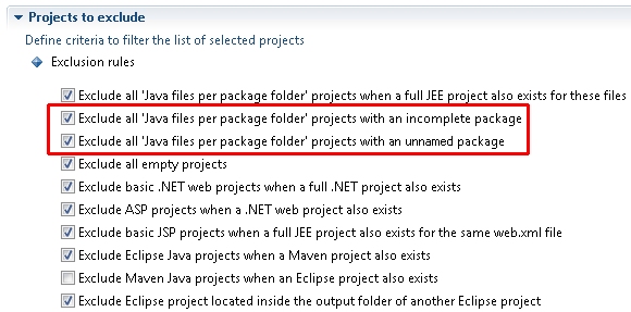 | Exclude all ‘Java files per package folder’ projects when a full JEE project also exists for these files | If the “out of the box” JEE discoverer and the “JEE File Discoverer” identify projects for the same .java files, then the “JEE File Discoverer” projects will be ignored in the Package Content tab after packaging in favour of the standard “out of the box” JEE discoverer projects. |