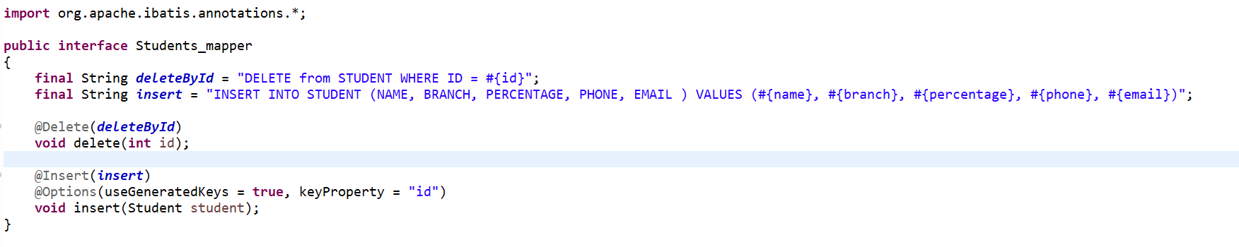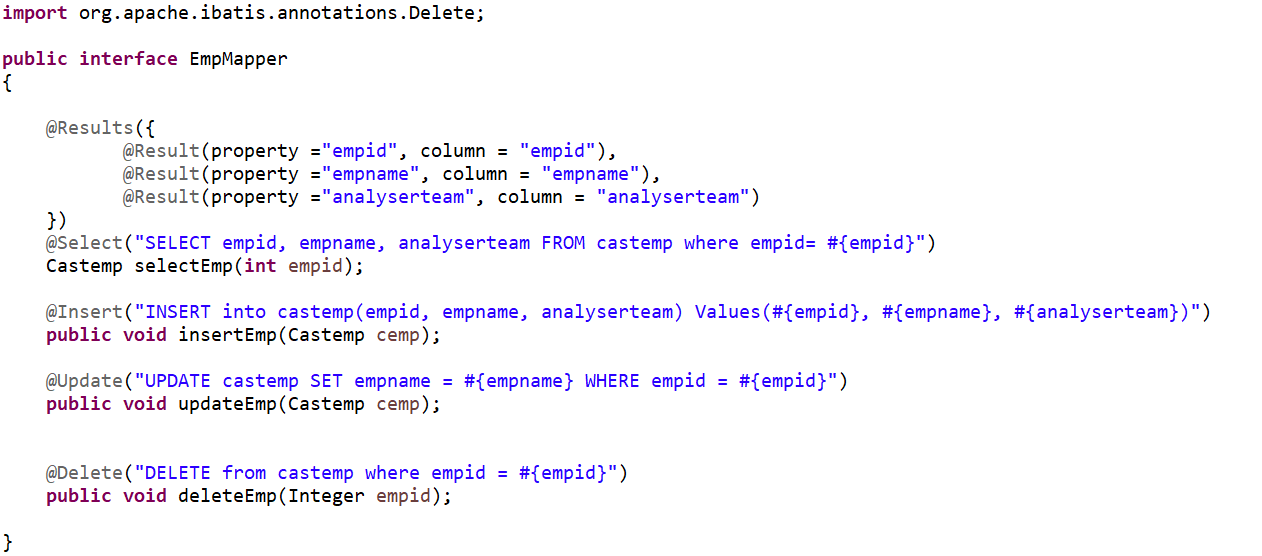 In Java mapper File, when we pass the SQL Queries with annotation parameter directly. Below is a MyBatis-Annotation sample source code with its result in Enlighten