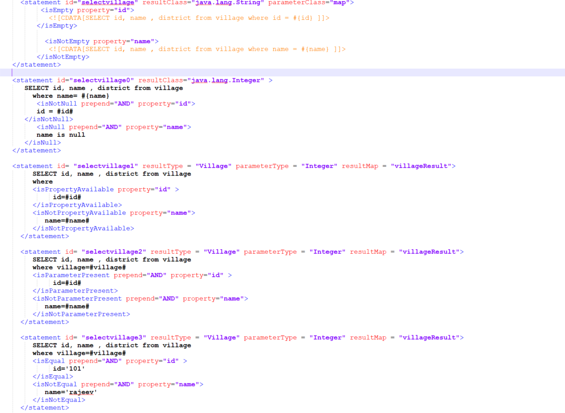 This extension provide support of following Dynamic SQL tag used in Mapper XML file. Below is list of tags support with sample source code and result in Enlighten:
