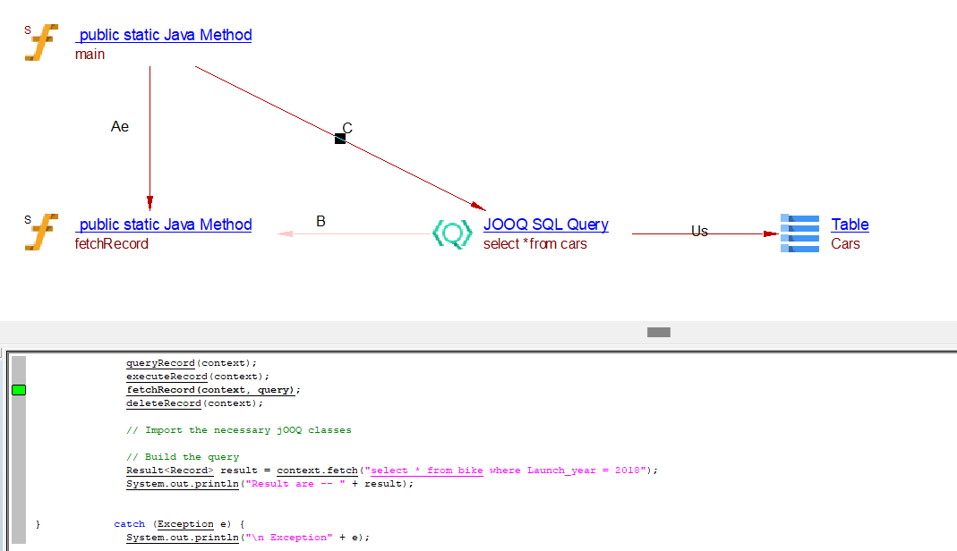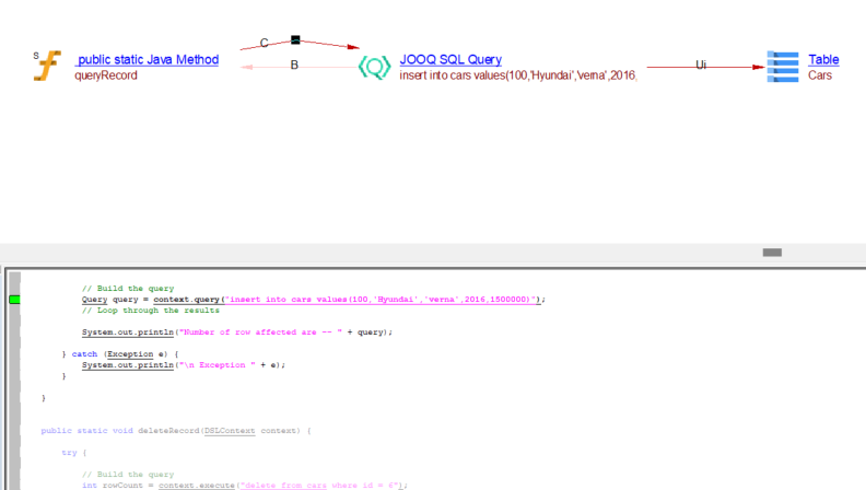 If your Java application contains CRUD operations with fluent API or “raw” SQL queries in its source code provided by jOOQ packages and you want to view these object types and their links, then you should install this extension.
