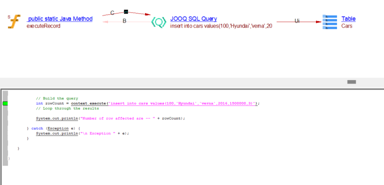int rowCount = context.execute("insert into cars values(100,'Hyundai','verna',2016,1500000,3)");