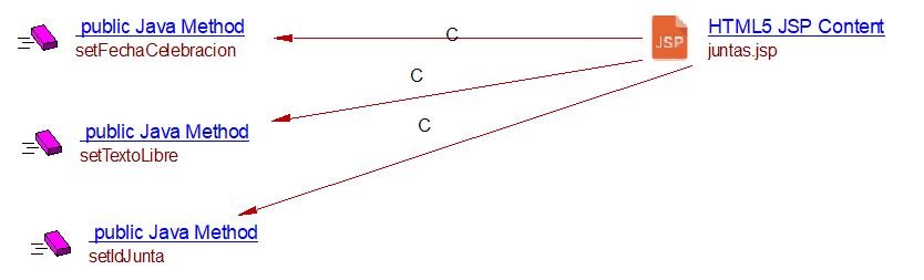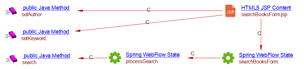 The view object searchBooksForm.jsp is linked to the java setter methods setAuthor and setKeyword via call links according to the modelization. author and keyword are the model properties.
