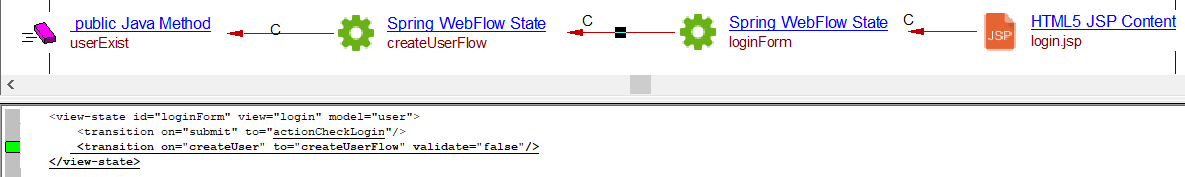 As seen in the code snippet above, the view-state ’loginForm’ invokes the subflow-state ‘createUserFlow’ on occurrence of a user event. Hence the callLink from Spring Web Flow State ’loginForm’ to Spring Web Flow subflow-state object ‘createUserFlow’. The state ’loginForm’ then waits for subflow to return and then resumes the main flow. The subflow-state evaluates ‘userExist’ java method. A property is set on the Spring Web Flow state object to indicate that it is a subflow-state.