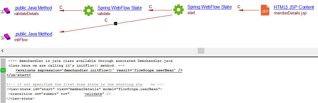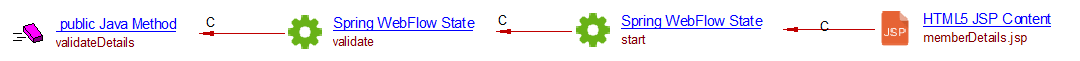 As seen in the code snippet above, the view-state ‘start’, on occurrence of a particular user event, invokes the action-state ‘validate’ and hence the callLink from the Spring Web Flow State object ‘start’ to the Spring Web Flow state object ‘validate’. The action-state invokes the ‘validateDetails’ method and hence the callLink from the Spring Web Flow object ‘validate’ to the java method ‘validateDetails’.