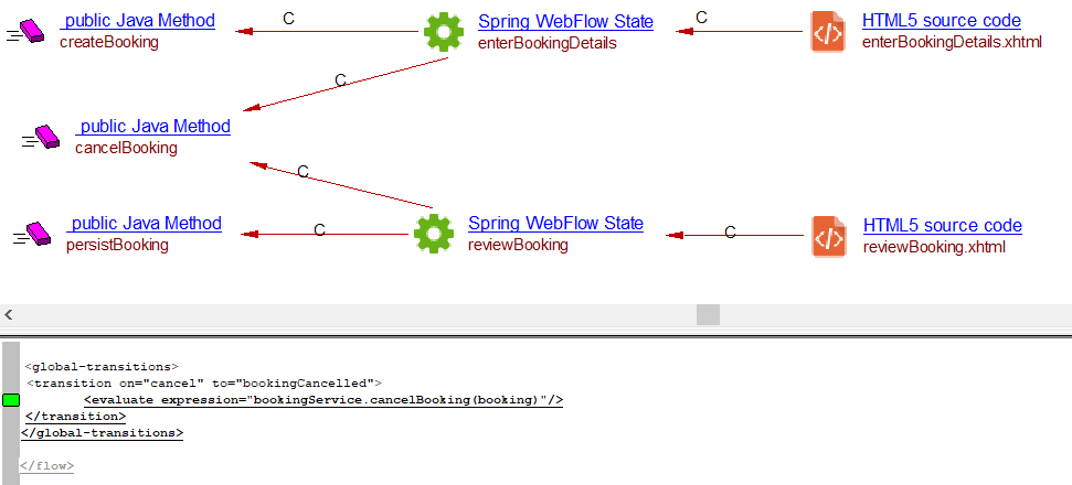 As per the code, both the state elements “enterBookingDetails” and “reviewBooking” call the “cancelBooking” java method as it is evaluated in the <global-transitions>.