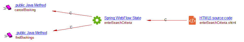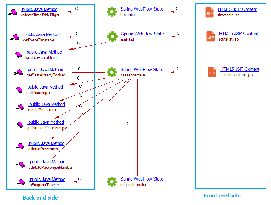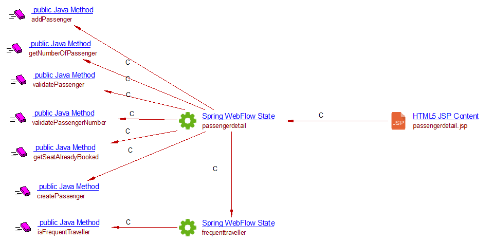 As seen in the code snippet above, the view-state ‘passengerdetail’ transits to decision-state ‘frequenttraveller’ on occurrence of a user event. Hence the callLink from Spring Web Flow State ‘passengerdetail’ to Spring Web Flow decision-state object ‘frequenttraveller’. On entering the decision-state ‘frequenttraveller’, the java method ‘isFrequentTraveller’ is invoked in the <if> element. Hence the callLink from Spring Web Flow object ‘frequenttraveller’ to the java method object ‘isFrequentTraveller’.