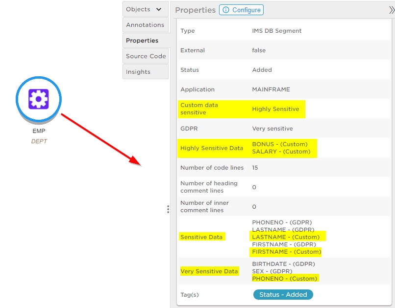 When a .datasensitive file is delivered and a defined key word matches an object name, the “sensitive” flag will be added as an object property, and the sensitive data will be listed. This can be seen using CAST Imaging: