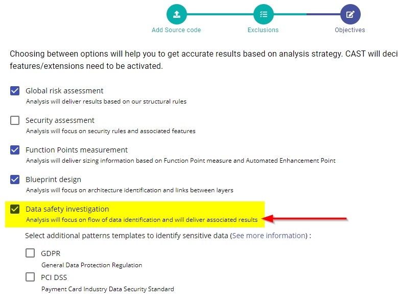 Note that if you are using the legacy workflow without Fast Scan in CAST Console (not required when using the Fast Scan workflow where this option is automatically enabled), you must also manually enable the Data Sensitivity option as part of the source code delivery process: