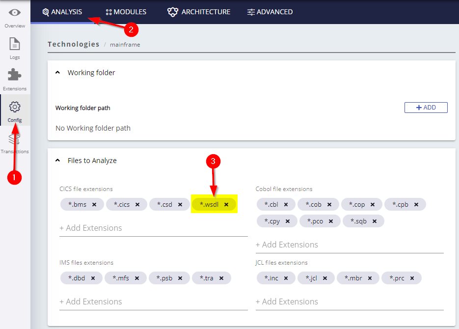 In order for CAST to be able to fully support CICS Webservices, the extension ***.wsdl **must be manually added to the CICS File Extensions option in the configuration of Mainframe extension in CAST Console: