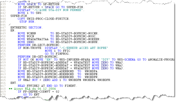 IMS database structure is directly analyzed by the Mainframe Analyzer through the database definition files (DBD). Without these files, you will not be able to analyze these databases. The IMS/DB accesses are made via embedded macros starting with “EXEC DLI” (in the CICS context only) or more generally through a technical sub-program called “CBLTDLI”. In addition, main programs making access to IMS contain the entry point “DLITCBL” at the beginning of the PROCEDURE division. So if you want to know if a program is an IMS program, then you should find out one of these syntaxes: