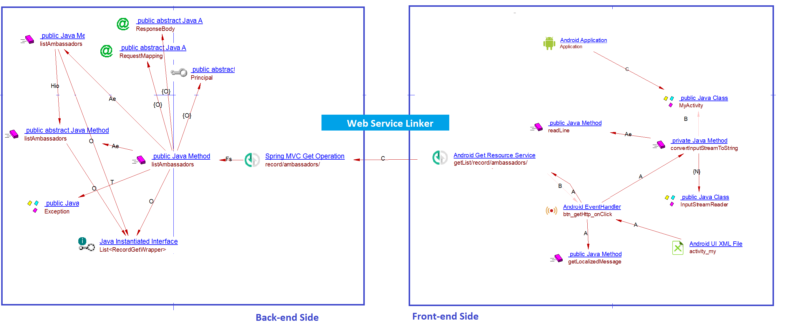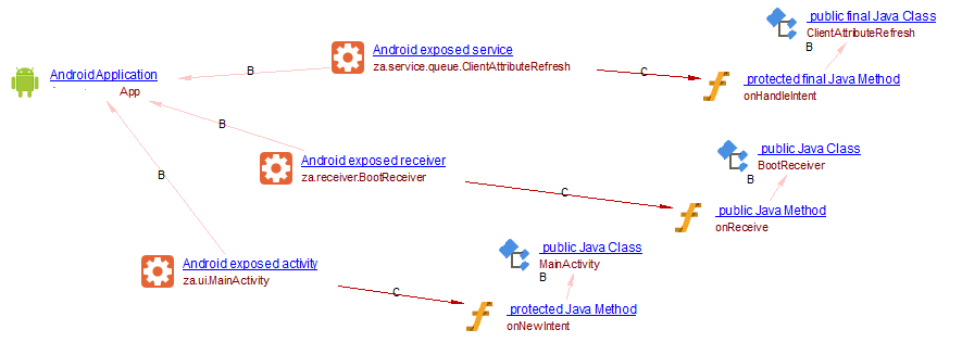 This file will be analyzed to understand whether the application is indeed an Android application. Some objects (exposed service/activity/receiver) are created under the manifest to represent exposed services. Then links are created from these services to the methods which are listeners of these services.