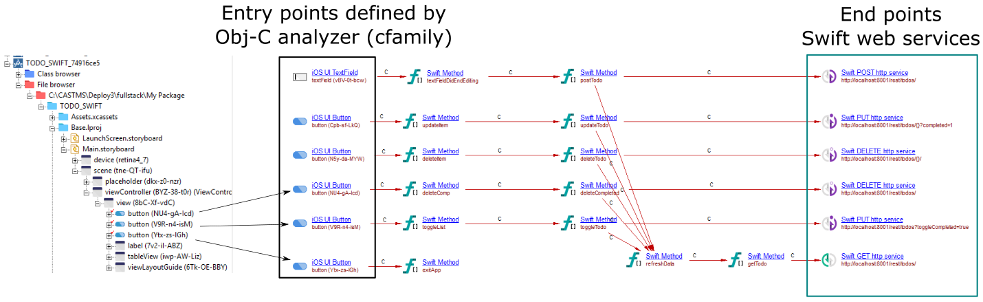 The (call) links from Swift objects (functions, methods, …) to Swift Web Service objects will be created by the analyzer as well. Similar to other analyzers, the responsible of further linking Services and Operations (possible inter-technology) is the dependency extension com.castsoftware.wbslinker. A picture of a simple call-graph including StoryBoard objects as entry points and Web Services as end points is shown in the following section.