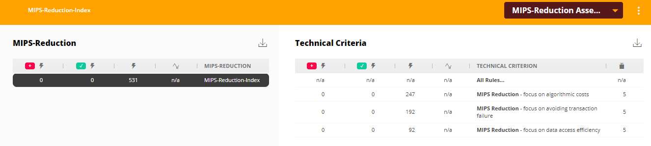 This extension will compute the MIPS (Million Instructions Per Second) Reduction Index as a Business Criterion with dedicated supporting Technical Criteria. All CAST rules that are tagged with a MIPS related tag will contribute to these MIPS specific Business and Technical Criteria, thereby allowing specific grades and rule violations to be reported.