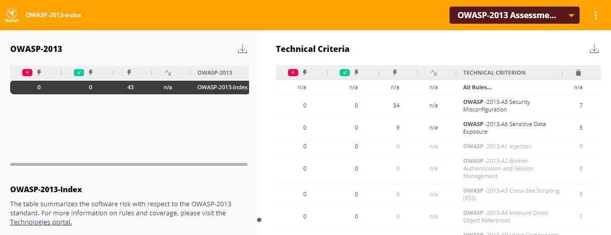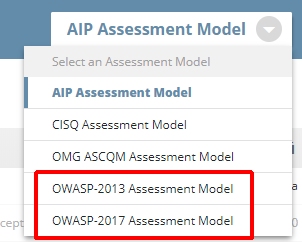 Out of the box, OWASP results are displayed in a specific interface - click either the OWASP-2013 or OWASP-2017 Assessment Model options (after clicking the Risk Investigation tile in the Application home page) to view the results: