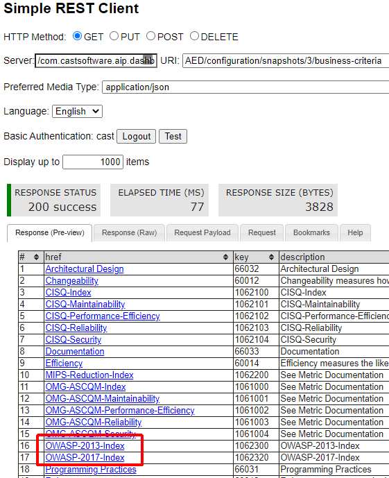The RestAPI can be used to query both the Dashboard (AED) and Measurement (AAD) schemas for results, for example for OWASP results: