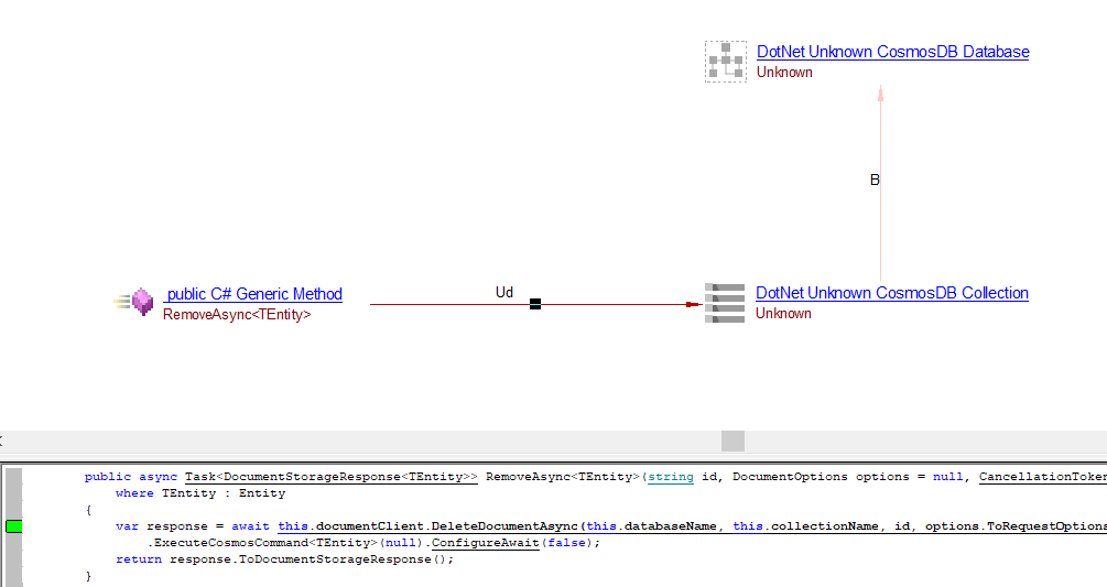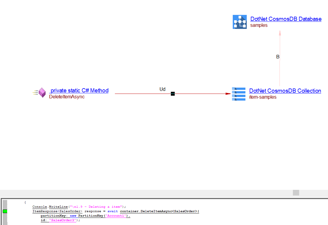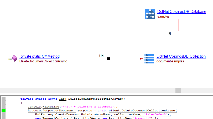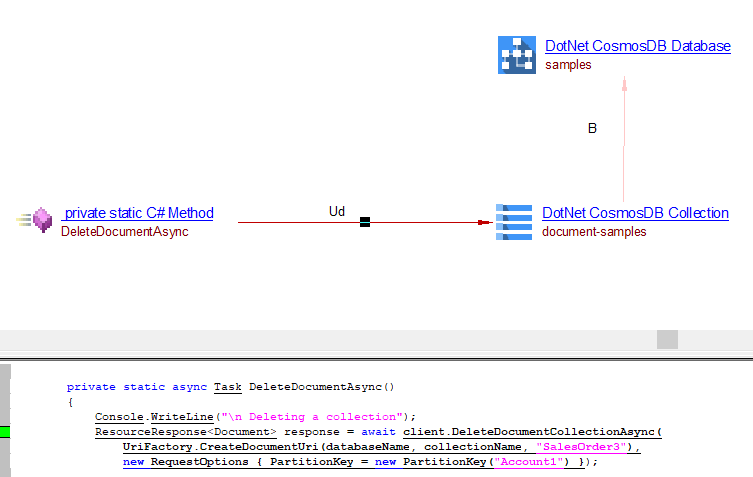 | useDeletetLink | Between the caller .NET Method objects and DotNet CosmosDB Collection object | DeleteDocumentAsync DeleteDocumentCollectionAsync DeleteItemAsync DeleteContainerAsync DeleteContainerStreamAsync DeleteCollectionAsync |
