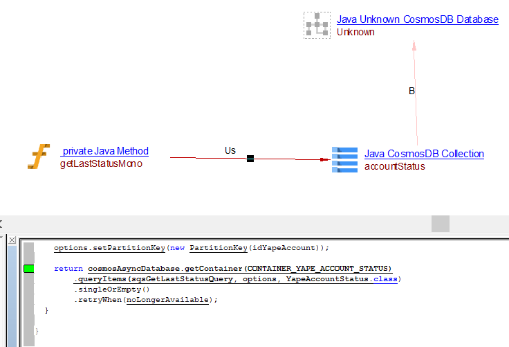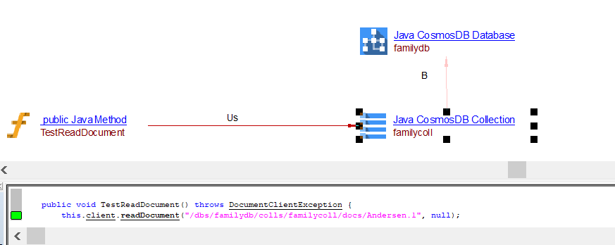 | useSelectLink | Between the caller Java Method objects and Java CosmosDB Collection object | ReadDocument ReadDocuments QueryDocuments ReadCollection queryItems readItem readAllItems readMany |