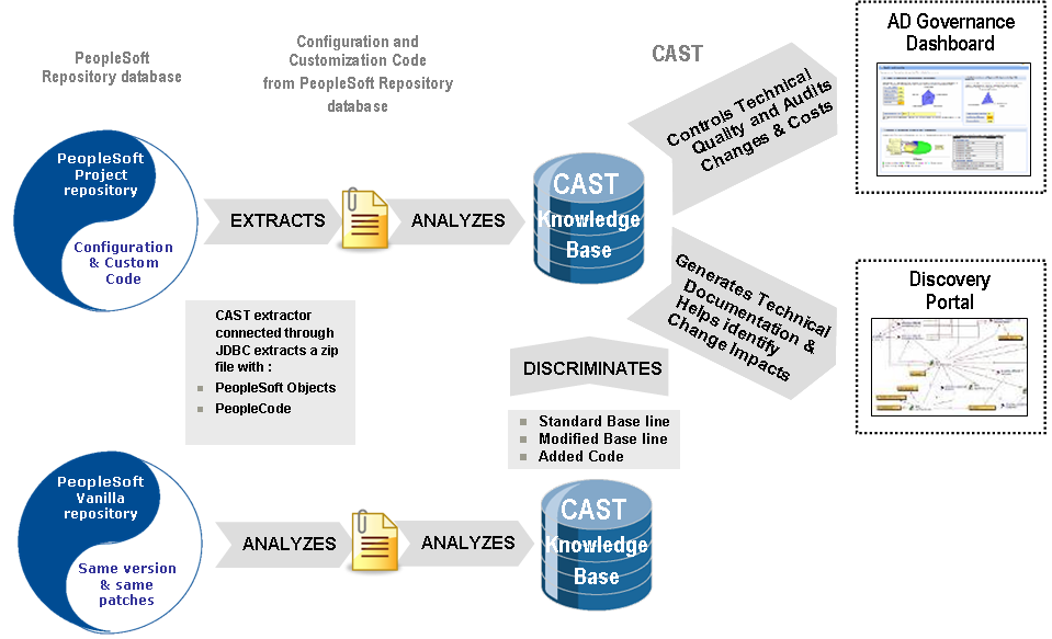 The image below describes the entire process of computing quality assessments of PeopleSoft projects, from the extraction of the PeopleSoft source code and meta-data to the integration of the quality results into the CAST AIP dashboards.