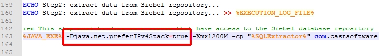 If you are using the standalone CAST Database Extractor with the Siebel-Extract-CLI.bat batch file to perform the database extraction, you must add the specific Java option to the batch file at line 163, immediately after %JAVA_EXE%: