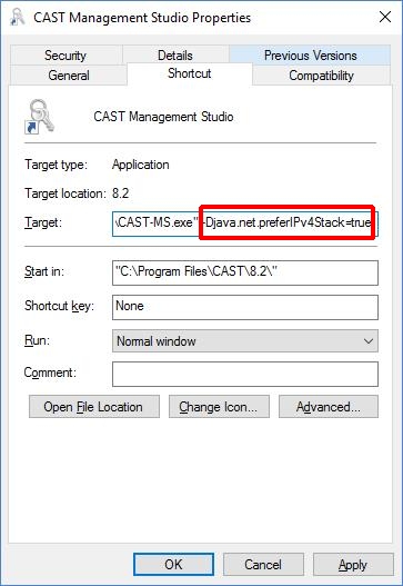 If you are using the CAST Delivery Manager Tool (DMT) launched via the CAST Management Studio to perform the database extraction, you must add the specific Java option to the shortcut that runs the CAST Management Studio executable on your workstation. Add the option to the Target field, immediately after CAST-MS.exe" : -Djava.net.preferIPv4Stack=true
