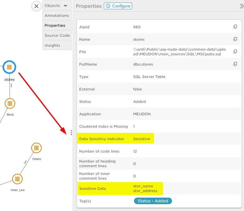 - Data Sensitivity Indicator: displays the most sensitive value (Sensitive, Very Sensitive, Highly Sensitive) for any of the columns in the selected table.