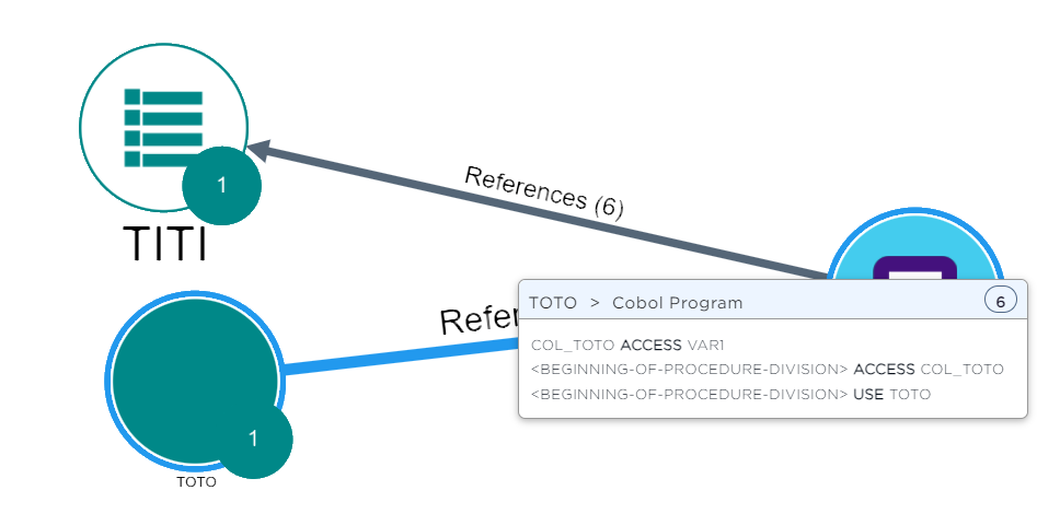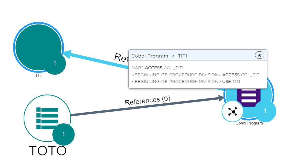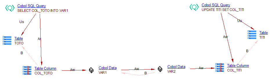 CAST does not create links between the COBOL data variables and selected columns in the WHERE clauses because those links are not significant for “how data circulates in an application”. To resume, CAST only creates accessWrite links as follows: