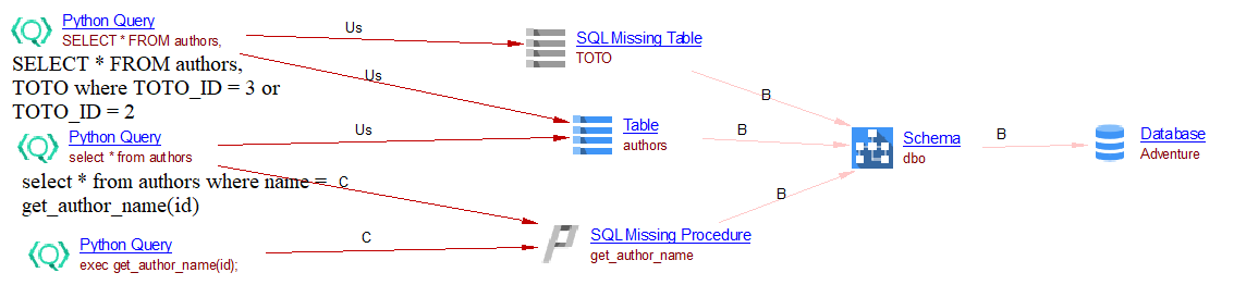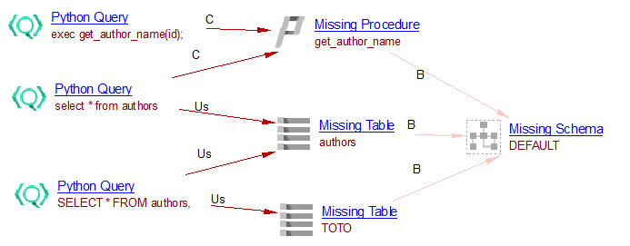 Based on the Python queries and the delivered SQL DDL, the extension will add a SQL Missing Table called “TOTO” and a SQL Missing Procedure called “get_author_name”. They are attached directly to the schema “dbo”. These two objects are linked with the Python queries: