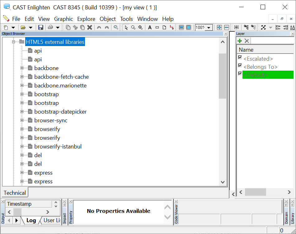 In HTML5/Javascript ≥ 2.1.21, the analyzer is capable of finding external libraries using package.json files (dependencies and devDependencies sections). It creates external libraries under a folder named “HTML5 external libraries” directly under the project root. One external library is created for each couple (library name, version), and include links are created from the javascript sources to these libraries. Only called libraries are created. Each library object contains a property for the version. These objects are of the type “HTML5 JavaScript Source Code”.