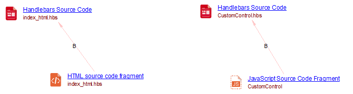 In HTML5/Javascript ≥ 2.1.29, the analyzer supports handlebars files (https://handlebarsjs.com/). This templating can be used in any kind of file type (javascript, HTML, text, or any other type). A detection process is carried out by the HTML5 extension to identify which kind of file represents the file. This is why a specific metamodel type “Handlebars Source Code” is created, and a HTML or Javascript fragment is created under this handlebars source code: