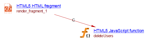 When you have purely JavaScript code inside an html fragment, the JavaScript code is analyzed and you will obtain links exactly as you would have in conventional JavaScript code. You can also have JavaScript functions inside HTML fragments, in this case, functions are children of the HTML fragment.