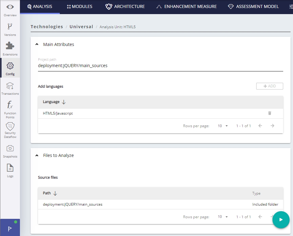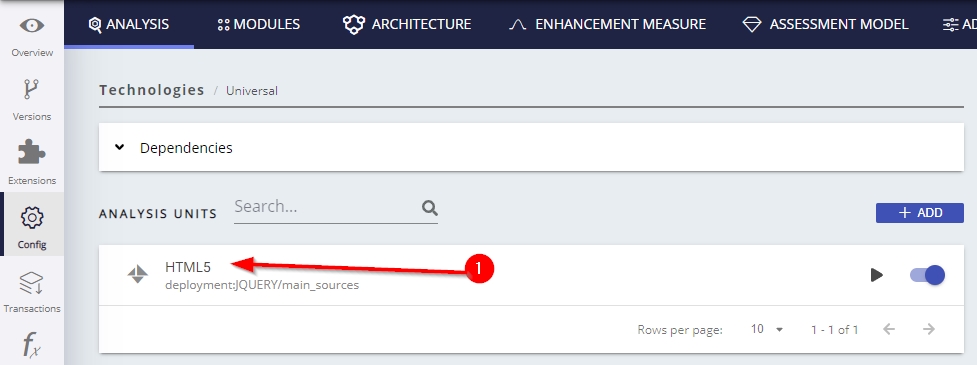 CAST Imaging Console exposes the technology configuration options once a version has been accepted/imported, or an analysis has been run. Click Universal Technology (3) in the Config (1) > Analysis (2) tab to display the available options for your SAPUI5 source code:
