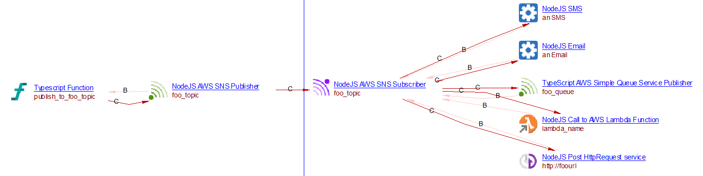 A Nodejs SNS Publisher object is created whenever a publication to a topic is found by the analyzer. Its name is that of the topic. For subscriptions, a Nodejs SNS Subscriber object is created. Its name is that of the topic. Then for each supported protocol, an object is created with a callLink from the subscriber to that object. The following protocols are supported: