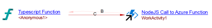 The startNew method from the “durable-function” client allow the client function to call an orchestrator function. The callActivity method from the “durable-function” package allows calling an activity function.Whenever one of these method calls is found in a JavaScript source code, a call to Azure function object is created. The name of the object is evaluated from the first argument of the call. If an azure function object with the same name exists a call link from the call to Azure function to that matching azure function is created.