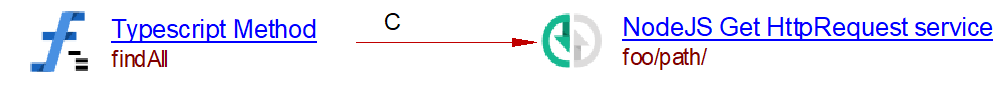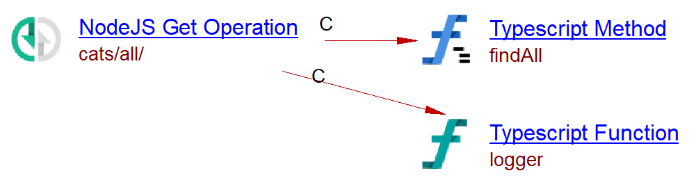 The analysis of the following code will create a Node.js Get Operation named cats/all/ with a call link from the operation to the handler method findAll. The URL corresponds to the concatenation of the argument of the @Controller decorator with that of the @Get decorator of the method. The decorator of each method defines the type of the operation.
